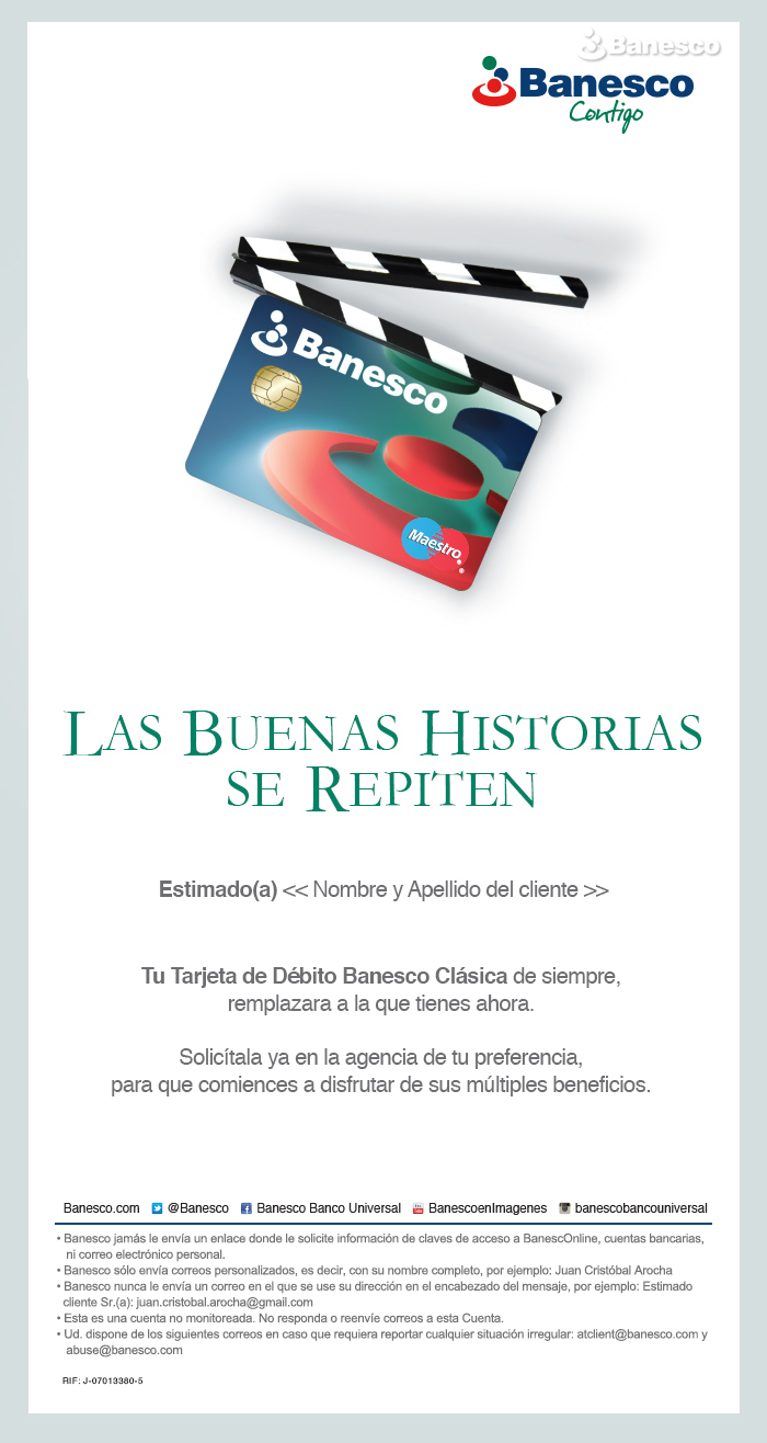 Aviso para email, reemplaza la tarjeta de débito Banesco clásica, se debe solicitar en la agencia de preferencia del cliente.