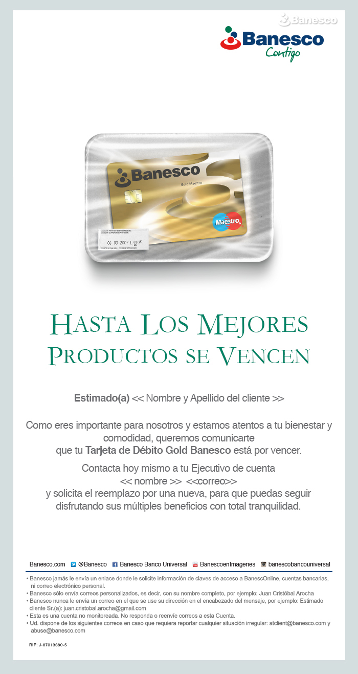 Aviso para email: Notificación de vencimiento de tarjeta de débito Gold, el cliente se debe contactar a su ejecutivo de cuenta y solicitar el remplazo de la misma, para seguir disfrutando de sus beneficios.