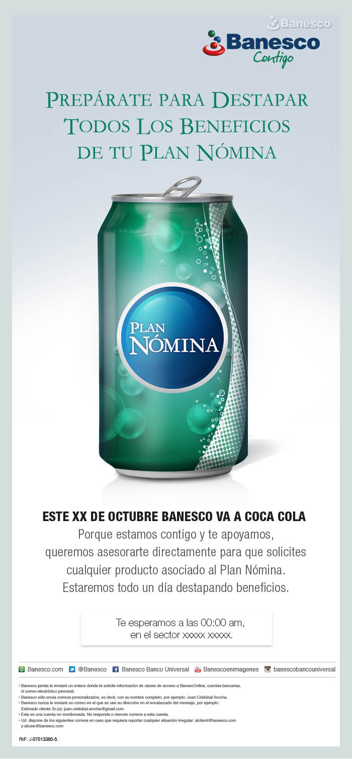 Aviso para email: Asesoramiento directo en Coca Cola para la solicitud de cualquier producto del plan nómina.