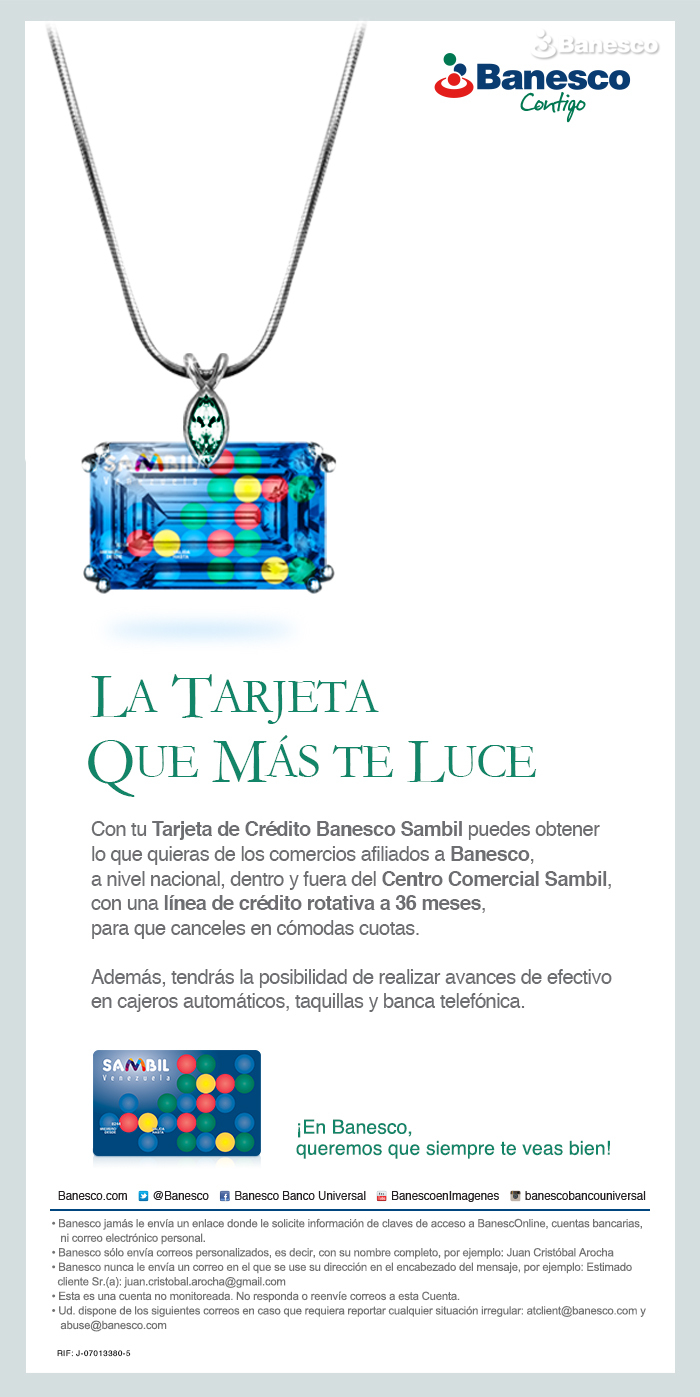 Aviso para email: Con la tarjeta de crédito Banesco Sambil puedes comprar en los comercios afiliados a Banesco a nivel nacional, con una línea de crédito rotativa a 36 meses.