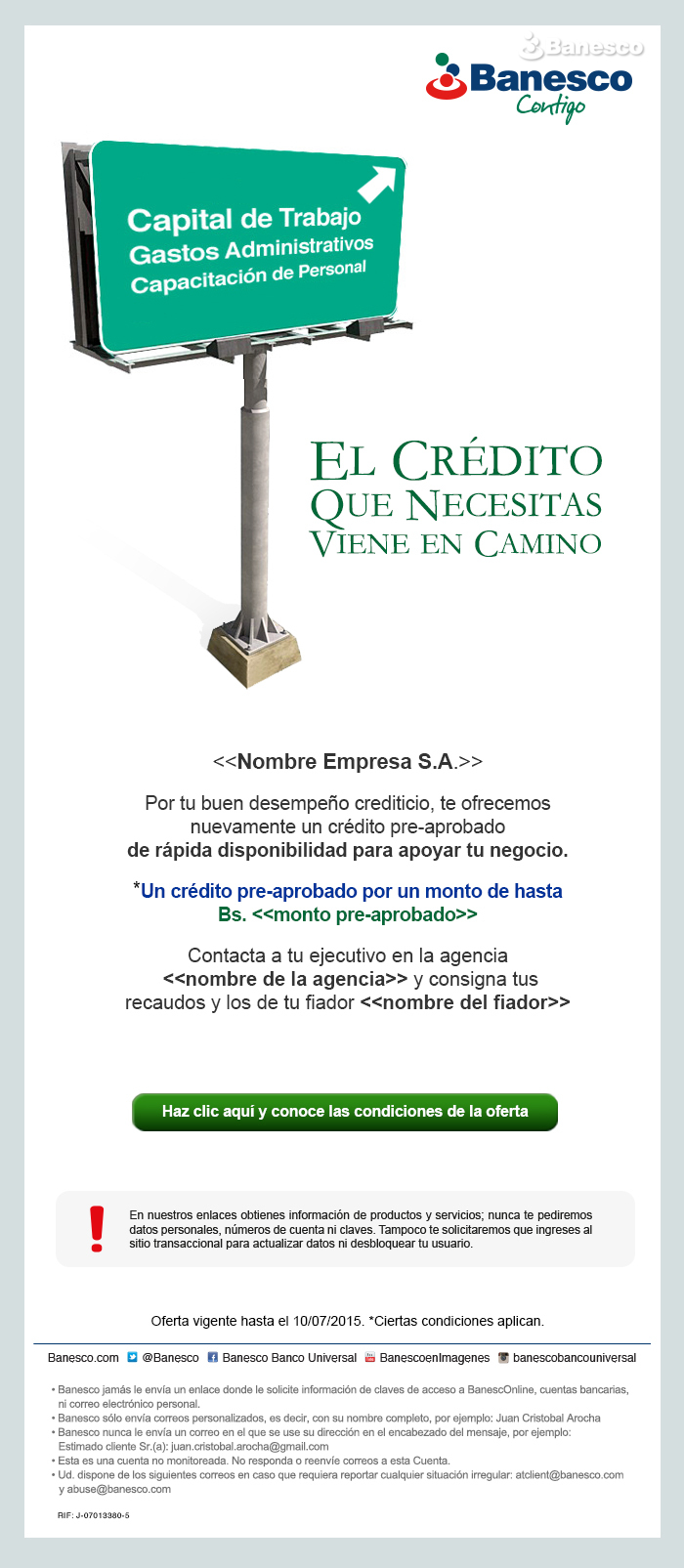 Aviso para email: Por un buen desempeño crediticio Banesco ofrece a su cliente un crédito pre-aprobado.
