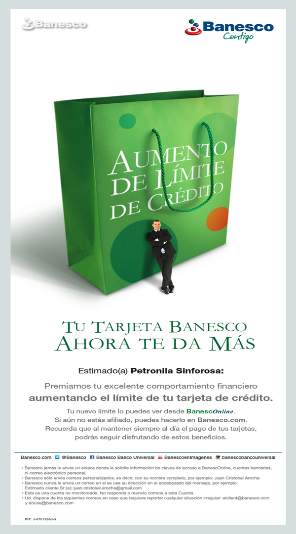 Aviso para email: Premio por excelente comportamiento financiero aumentan la tarjeta de crédito, el nuevo límite se puede ver en BanescOnline y recordar mantener el pago de las tarjetas al día.