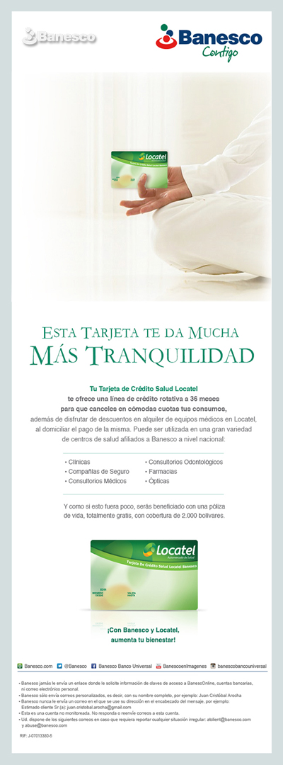 Aviso para email: La Tarjeta de Crédito Salud Locatel te ofrece una línea rotativa a 36 meses, descuento en alquiler de equipos médicos, uso en todos los centros afiliados a Banesco a nivel nacional y además cuenta con una póliza de vida, totalmente gratis.