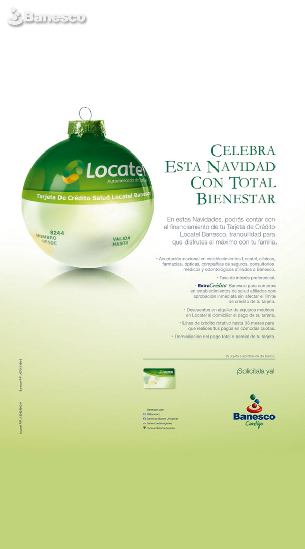 Aviso en prensa impulso uso y solicitud de la Tarjeta de Crédito Salud Locatel Banesco con motivo navideño. "Celebra esta Navidad con total bienestar".