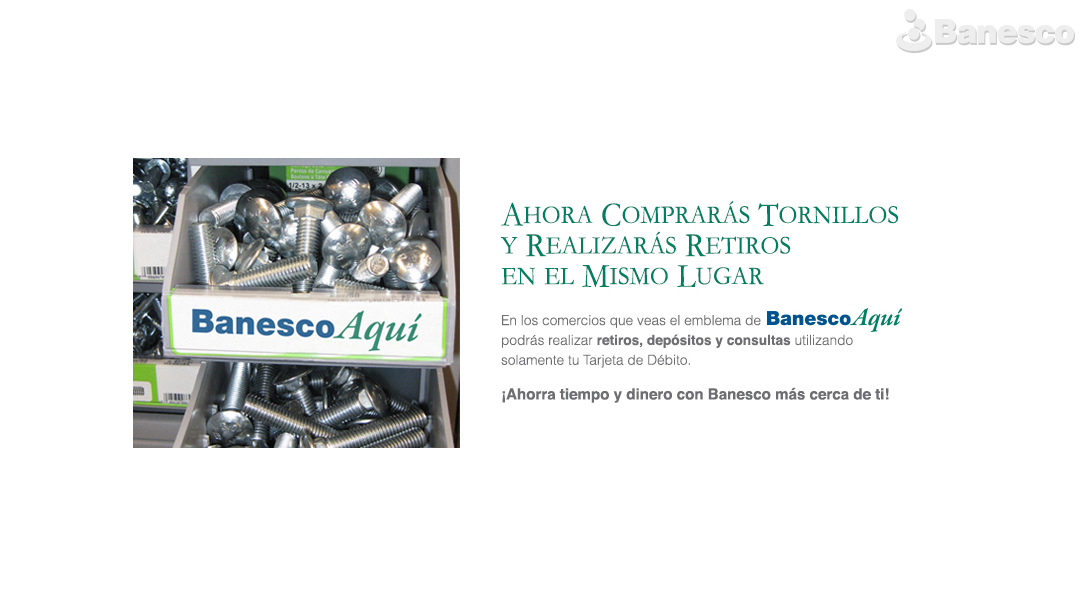 Cintillo publicitario de BanescoAquí ofreciendo los servicios de retiros, depósitos y consultas utilizando solo tu tarjeta de débito, desde cualquier establecimiento con el símbolo de BanescoAquí. Versión tornillos.