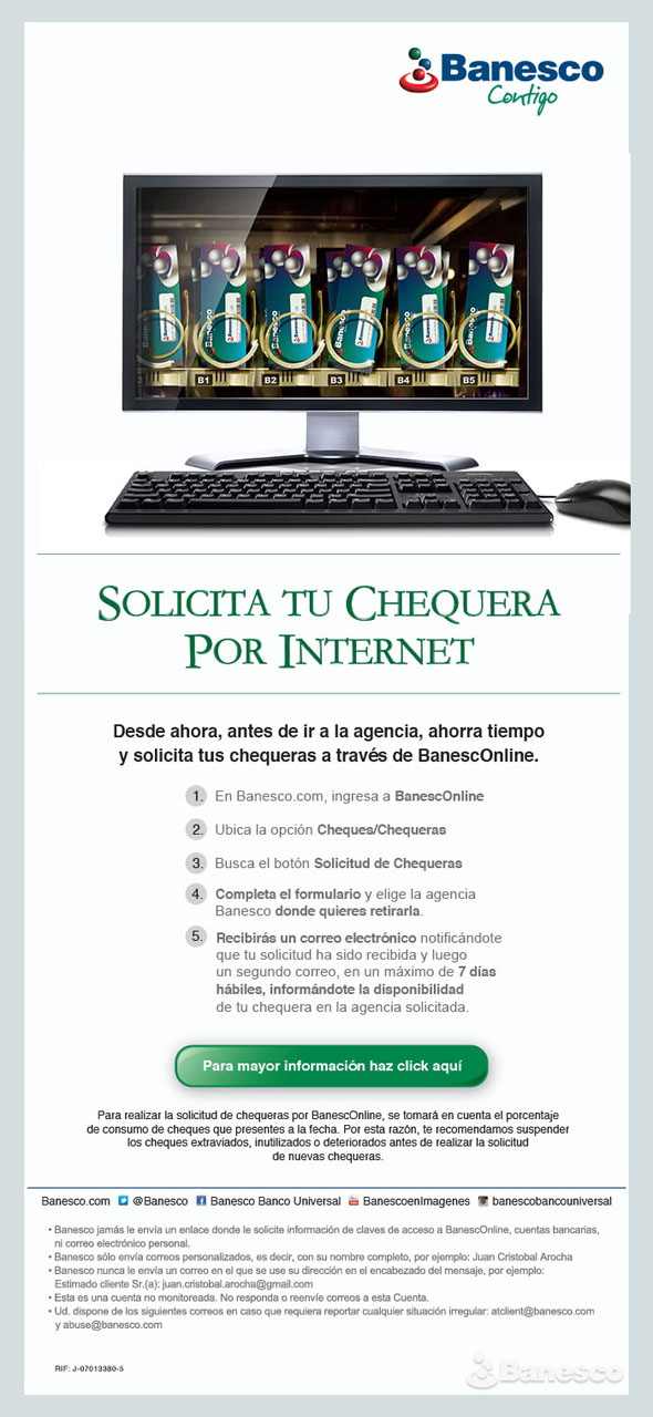 Publicidad de BanescOnline ofreciendo el servicio de solicitud de chequeras a través de la Banca Electrónica, sin necesidad de ir a la agencia.