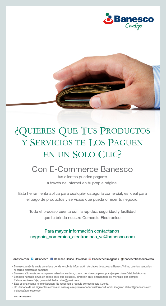 Publicidad de E-Commerce Banesco mediante la cual se ofrece el servicios dueños de empresas pueden solicitar que sus clientes le paguen a través de Internet desde la propia página de la empresa.