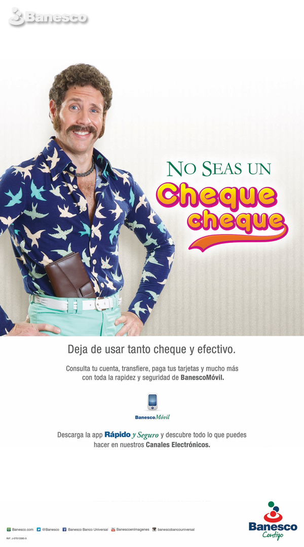 Imagen publicitaria acerca de los servicios ofrecidos por BanescoMóvil: ''Deja de usar tanto cheque y efectivo. Consulta tu cuenta, transfiere, paga tus tarjetas y mucho más con toda la rapidez y seguridad de BanescoMóvil'', promoviendo el uso de la nueva aplicación.