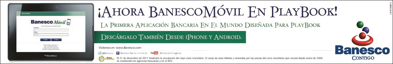 Cintillo de BanescoMóvil informando promocionando la aplicación como la primera en el mundo diseñada para PlayBook.