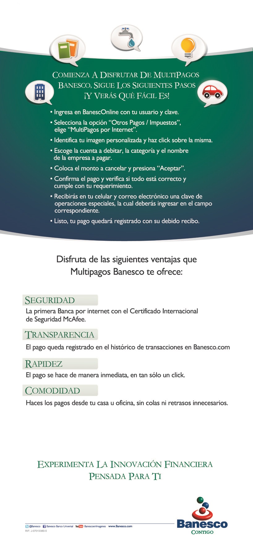 Volante informativo acerca de los beneficios y los pasos a seguir para hacer uso del servicio Multipagos de Banesco Banco Universal.