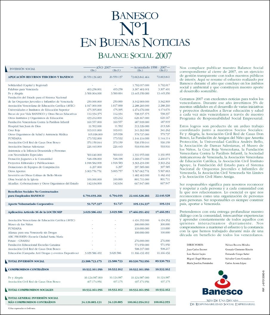 Resumen del Balance Social de Banesco Banco Universal, para el periodo de 1998 - 2007.