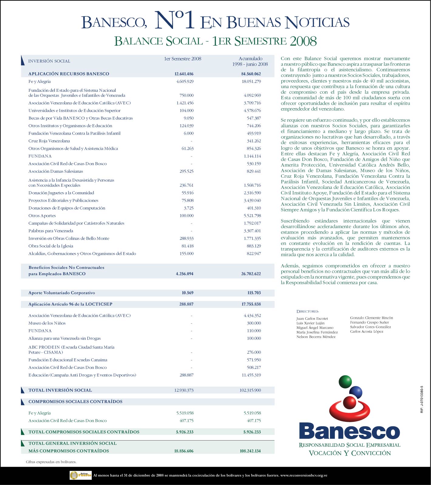 Resumen del Balance Social de Banesco Banco Universal, para el periodo de 1998. Primer semestre del año 2008.