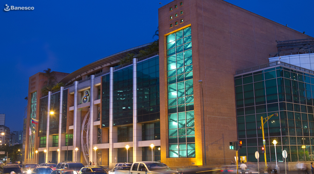 Sede de Banesco Banco Universal, Ciudad Banesco, ubicada en Bello Monte. Vista diagonal nocturna.