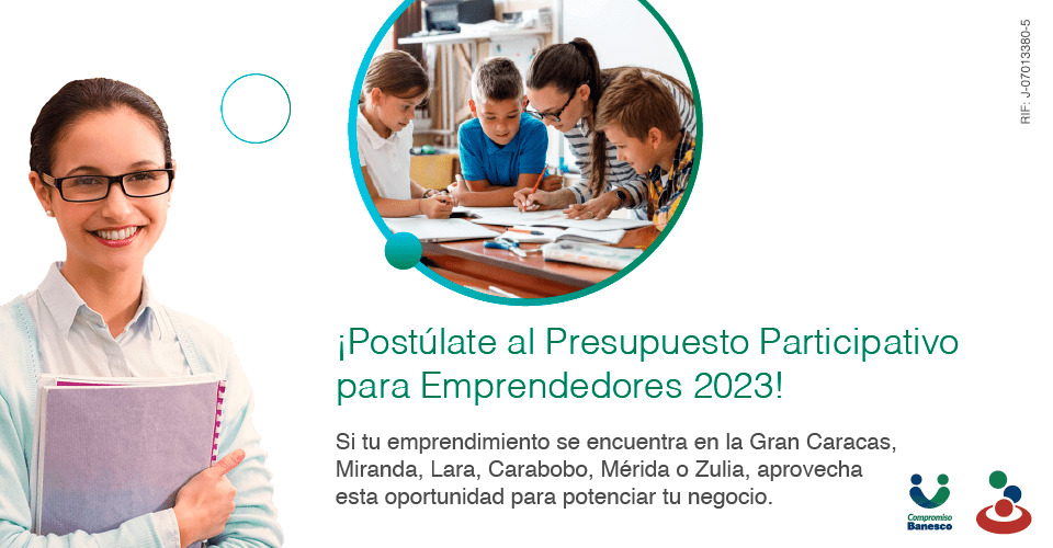 Por segundo año consecutivo, Banesco ofrece la oportunidad a emprendedores certificados en su Programa de Formación de Microempresarios, de postular sus planes de negocio al Presupuesto Participativo 2023. Esta iniciativa busca impulsar ideas de negocio o emprendimientos, bajo el aporte de un capital semilla de Bs. 85.500 no reembolsables, para cada ganador. Para más información presione aquí