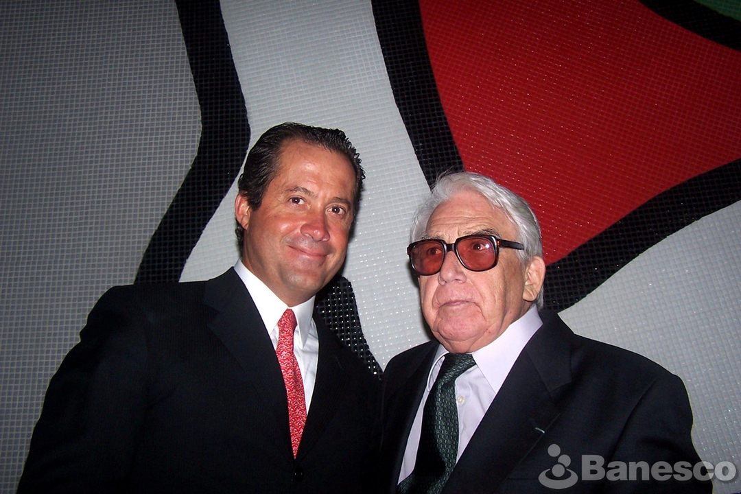 El artista venezolano Oswaldo Vigas y Juan Carlos Escotet Rodríguez junto a la trilogía Banesco. Mural realizado especialmente para la infraestructura de Ciudad Banesco, sede principal de Banesco Banco Universal, ubicada en Caracas.
