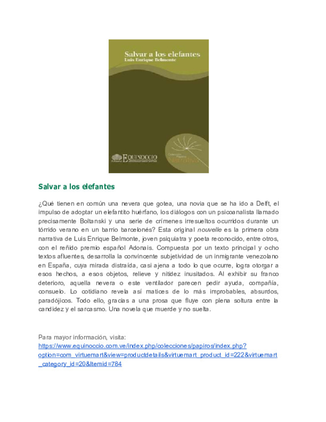 ¿Qué tienen en común una nevera que gotea, una novia que se ha ido a Delft, el impulso de adoptar un elefantito huérfano, los diálogos con un psicoanalista llamado precisamente Boltanski y una serie de crímenes irresueltos ocurridos durante un tórrido verano en un barrio barcelonés? Esta original nouvelle es la primera obra narrativa de Luis Enrique Belmonte, joven psiquiatra y poeta reconocido, entre otros, con el reñido premio español Adonais. Compuesta por un texto principal y ocho textos afluentes, desarrolla la convincente subjetividad de un inmigrante venezolano en España, cuya mirada distraída, casi ajena a todo lo que ocurre, logra otorgar a esos hechos, a esos objetos, relieve y nitidez inusitados. Al exhibir su franco deterioro, aquella nevera o este ventilador parecen pedir ayuda, compañía, consuelo. Lo cotidiano revela así matices de lo más improbables, absurdos, paradójicos. Todo ello, gracias a una prosa que fluye con plena soltura entre la candidez y el sarcasmo. Una novela que muerde y no suelta.