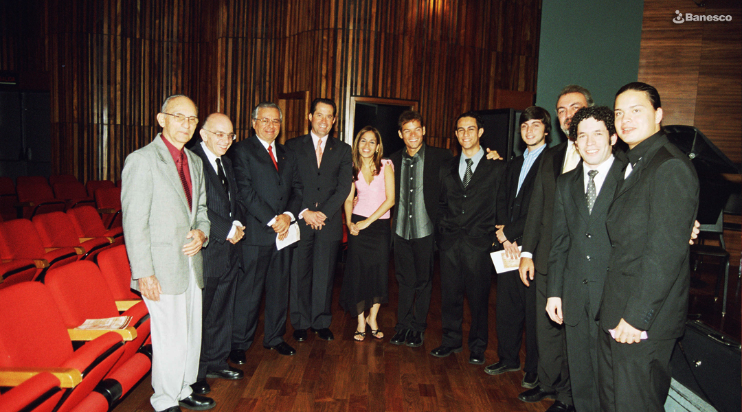 Juan Carlos Escotet Rodríguez y José Antonio Abreu (segundo a la izquierda), músico, economista, educador venezolano y fundador del Sistema Nacional de Coros y Orquestas Juveniles e Infantiles de Venezuela; durante acto en el auditorio Fernando Crespo Suñer de Ciudad Banesco, con la Orquesta de Cuerdas Jóvenes Arcos, bajo la dirección de Gustavo Dudamel (segundo a la derecha).