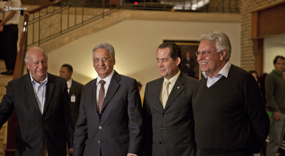 Juan Carlos Escotet Rodríguez junto al expresidente de Chile Ricardo Lagos Escobar, el expresidente de Brasil Fernando Henrique Cardoso y el político, orador, activista del Partido Socialista Obrero Español y ex presidente español Felipe González.