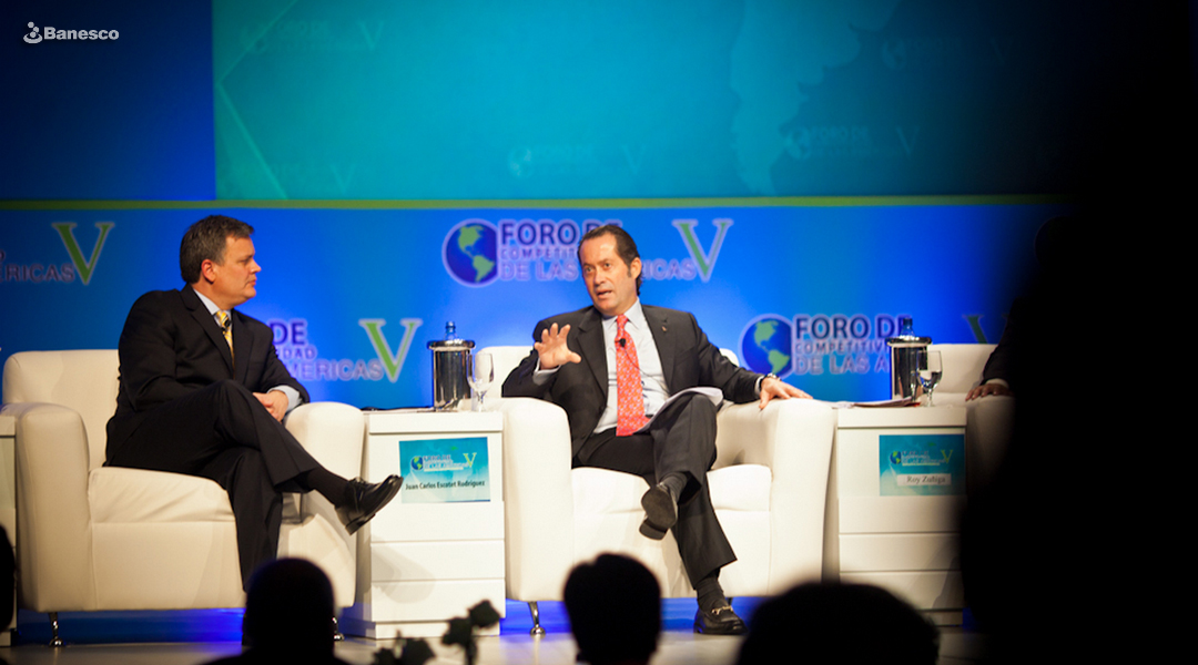 Xavier Serbiá, moderador en el V Foro de Competitividad de las Américas, economista, experto en estrategias de finanzas y negocios y ex-integrante del grupo Menudo y Juan Carlos Escotet Rodríguez.