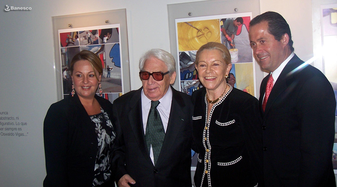 Juan Carlos Escotet Rodríguez y Oswaldo Vigas junto a familiares del artista después de la inauguración de el Mural "Trilogía".