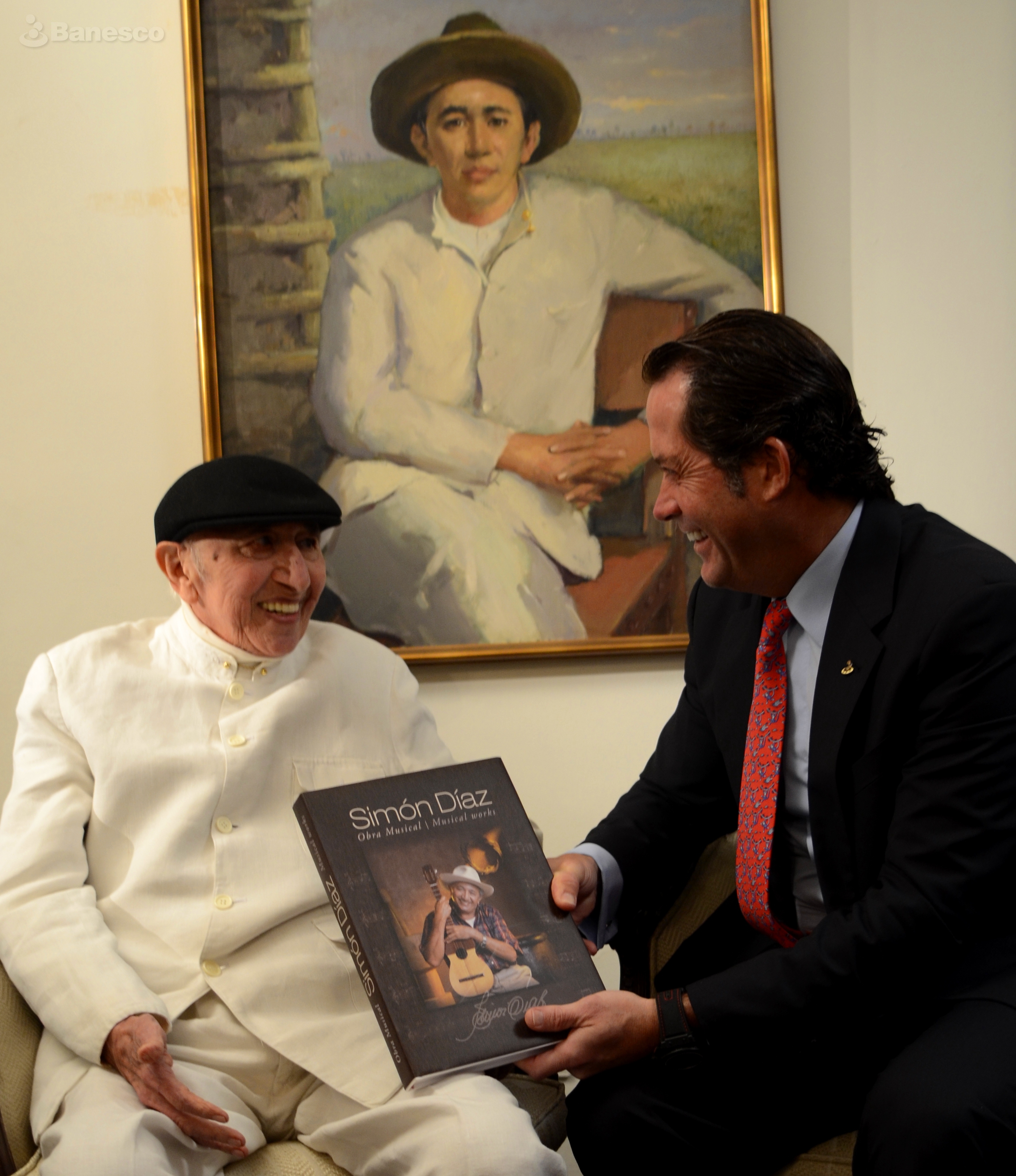 Juan Carlos Escotet Rodríguez haciendo entrega del primer ejemplar del Libro "Obras de Simón Díaz" al célebre cantante, compositor, poeta y humorista venezolano Simón Díaz.