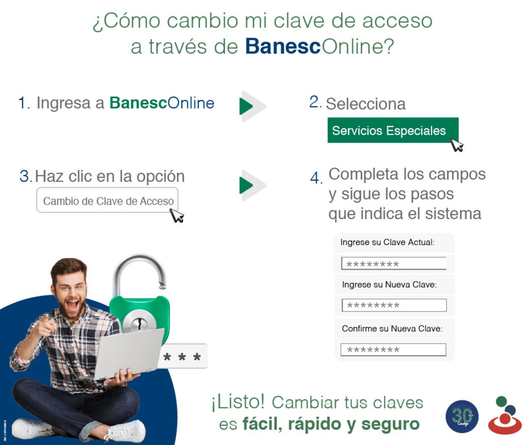 ¿Requieres cambiar tu clave de acceso a #BanescOnline? Ante cualquier eventualidad, gestiona y cambia la clave de tu acceso a la banca en línea, sin necesidad de visitar nuestras agencias.