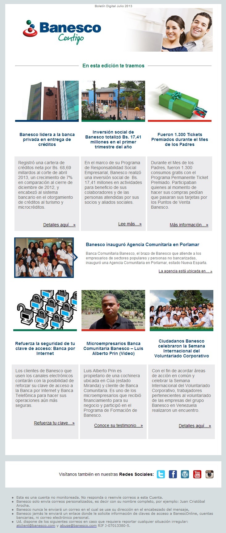 El Boletín Digital de julio 2013 contiene la siguiente información: Banesco lidera a la Banca Privada, Inversión social de Banesco totalizó 17.41 millones, Banesco inauguró agencia comunitaria en Porlamar, Ciudadanos Banesco celebraron la semana Internacional del Voluntariado.
