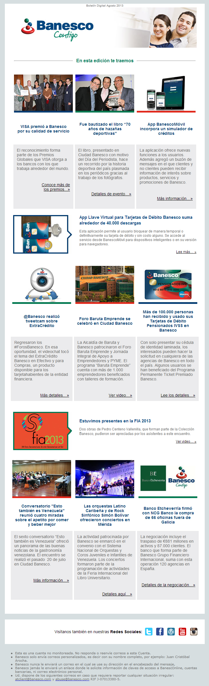 El Boletín Digital de agosto 2013 contiene la siguiente información: Visa premió a Banesco, App Banesco Móvil incorpora simulador de créditos, en Ciudad Banesco fue bautizado el libro "70 Años de Hazañas Deportivas", Foro Baruta Emprende se celebró en Ciudad Banesco, Conversatorio "Esto También es Venezuela", Tweetcam sobre Extracrédito.