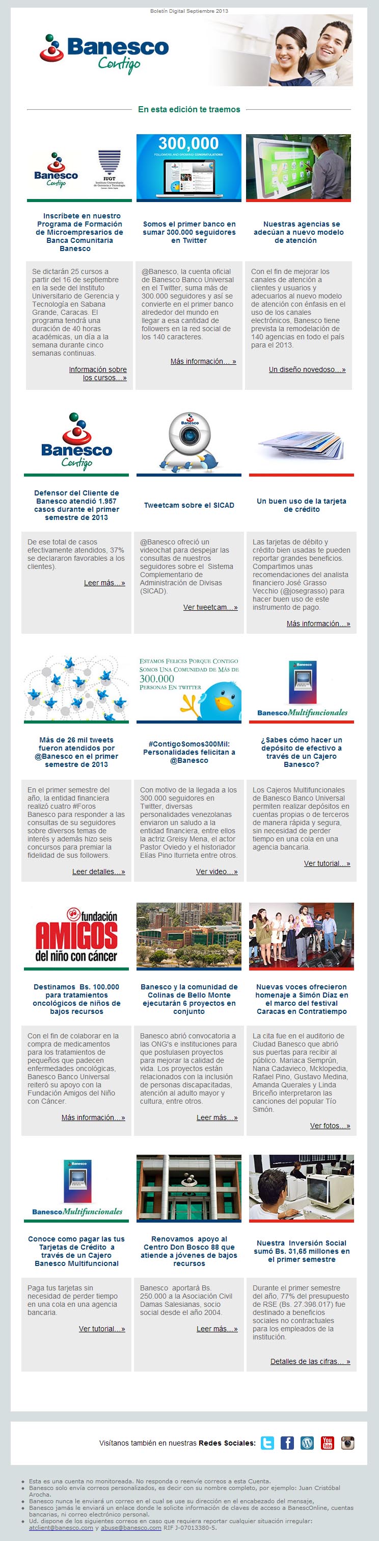 El Boletín Digital de septiembre 2013 contiene la siguiente información: Programa de Formación de Microempresarios, Banesco el primer Banco que suma 300.000 seguidores en Twitter, Tweetcam sobre el SICAD, Buen uso de las Tarjetas de Crédito.