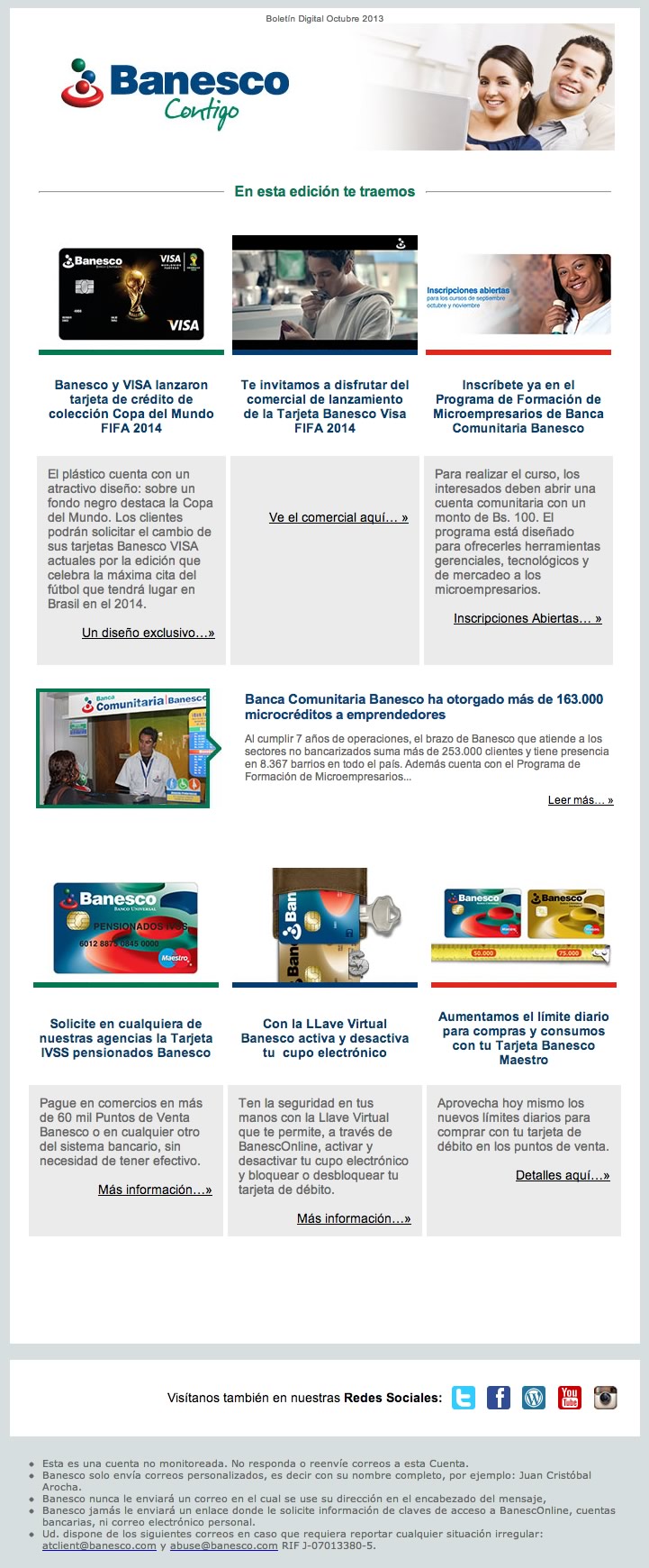 El Boletín Digital de octubre 2013 contiene la siguiente información: Banesco y Visa lanzaron Tarjeta de Crédito Copa del Mundo, Programa de Formación de Microempresarios, Banca Comunitaria Banesco otorgó microcréditos a emprendedores.