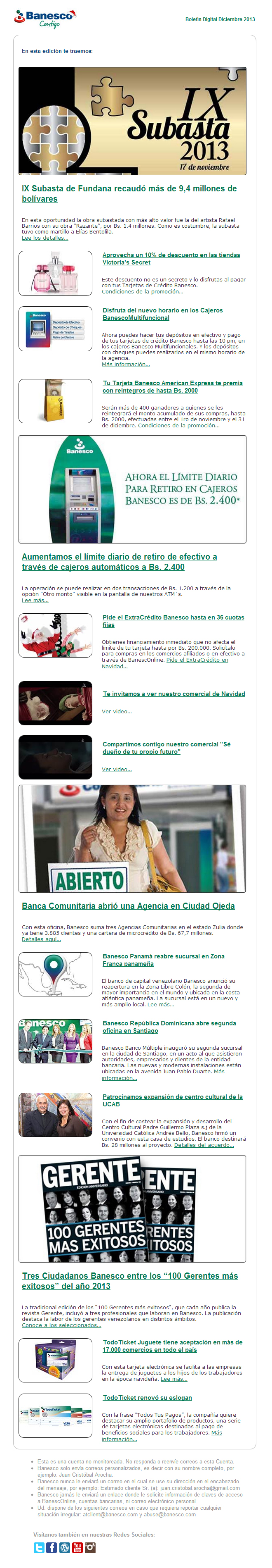 El Boletín Digital de diciembre 2013 contiene la siguiente información: IX subasta Fundana recaudó 9.4 millones, aumentó el retiro diario de efectivo en cajeros automáticos, Banca Comunitaria abrió agencia en Ciudad Ojeda, Banesco Panamá reabre sucursal, Banesco República Dominicana abre segunda oficina en Santiago, TodoTicket renovó eslogan.