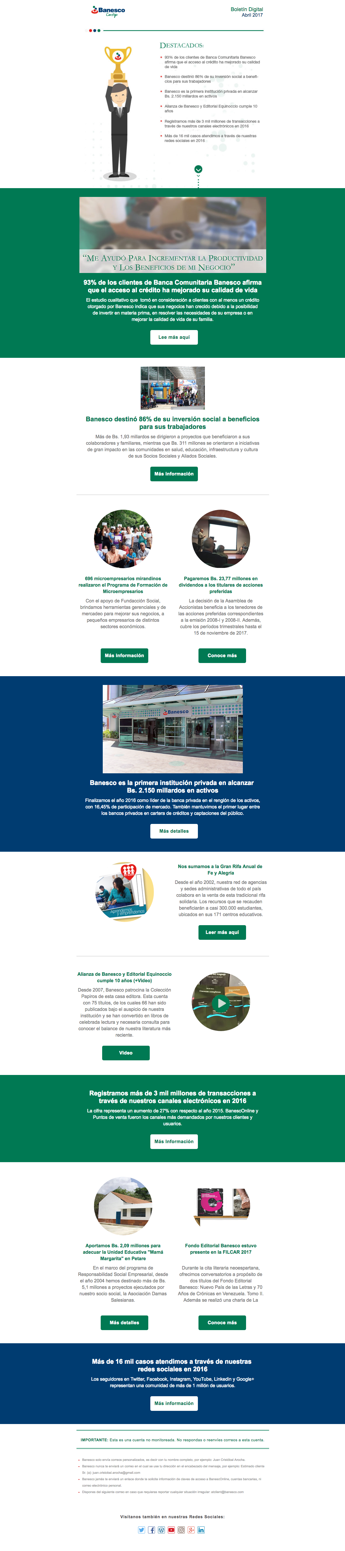 El Boletín Digital de abril 2017 contiene la siguiente información: Banesco destinó 86% de su inversión social a beneficios para sus trabajadores , Pagaremos Bs. 23,77 millones en dividendos a los titulares de acciones preferidas , Banesco es la primera institución privada en alcanzar Bs. 2,150 millardos en activos , Registramos más de 3 mil millones de transacciones a través de nuestros canales electrónicos en 2016.