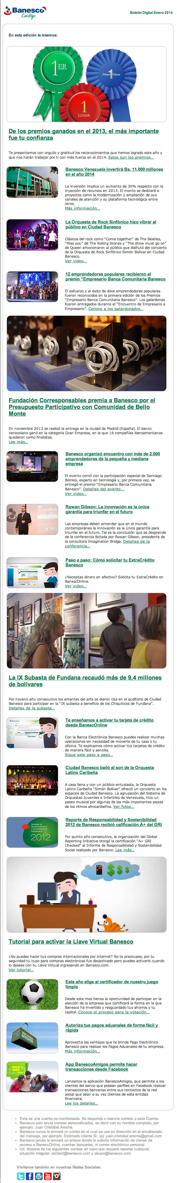 El Boletín Digital de enero 2014 contiene la siguiente información: Banesco Venezuela invertirá 11,000 millones en el año 2014, 12 emprendedores populares recibieron el premio "Empresario Banca Comunitaria Banesco", Fundación corresponsables premia a Banesco por el presupuesto participativo con Comunidad de Bello Monte, Paso a paso: Cómo solicitar tu extracrédito Banesco, La IX subasta de Fundana recaudó más de 9,4 millones de Bolívares, Reporte de responsabilidad y sostenibilidad 2012 de Banesco recibió calificación A+ de GRI.