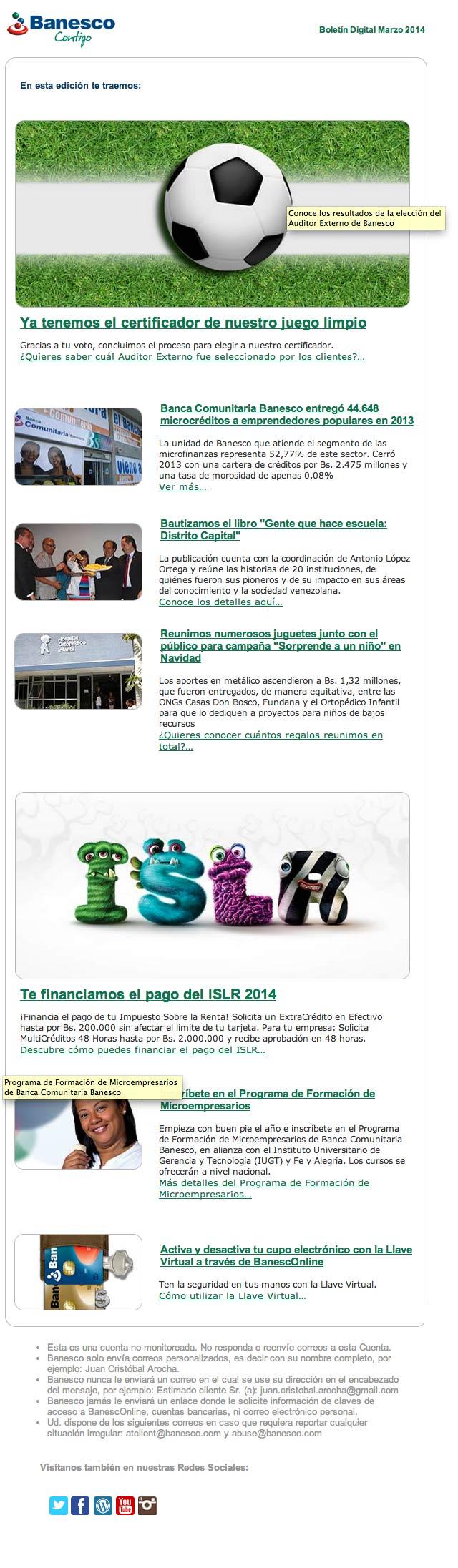 El Boletín Digital de marzo 2014 contiene la siguiente información: Banca Comunitaria Banesco entregó 44,648 microcréditos a emprendedores populares en 2013, Reunimos numerosos juguetes junto con el público para campaña "Sorprende a un niño" en Navidad, Te financiamos el pago del ISLR 2014.
