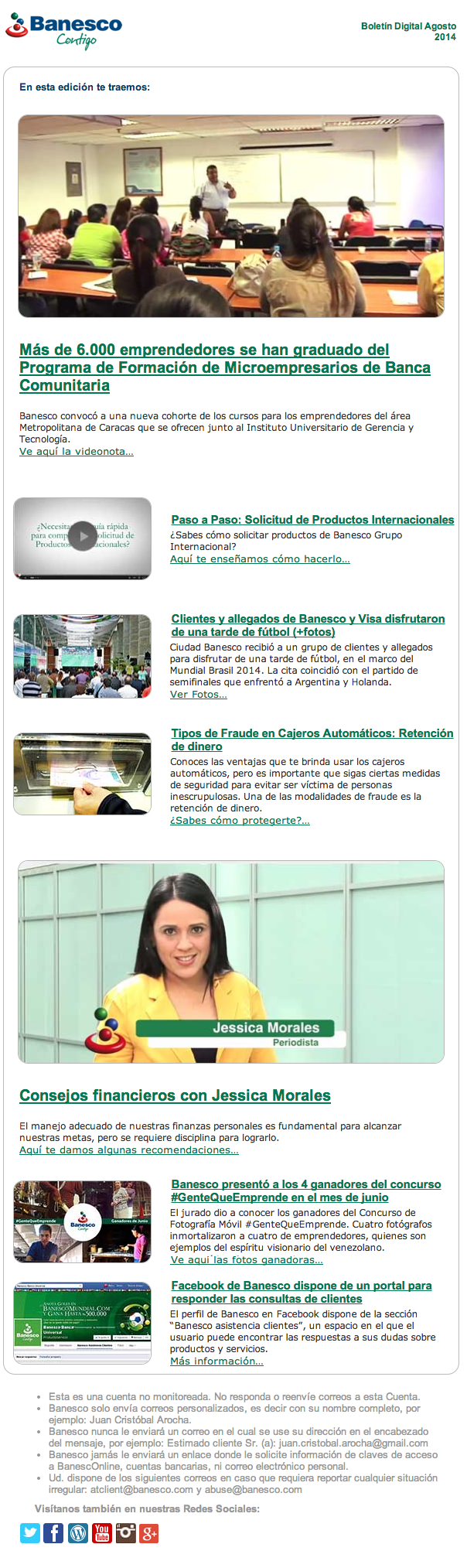 El Boletín Digital de agosto 2014 contiene la siguiente información: Más de 6,000 emprendedores se han graduado del Programa de Formación de Microempresarios de Banca Comunitaria, Tipos de fraude en cajeros automáticos: Retención de dinero, Facebook de Banesco dispone de un portal para responder las consultas de clientes.