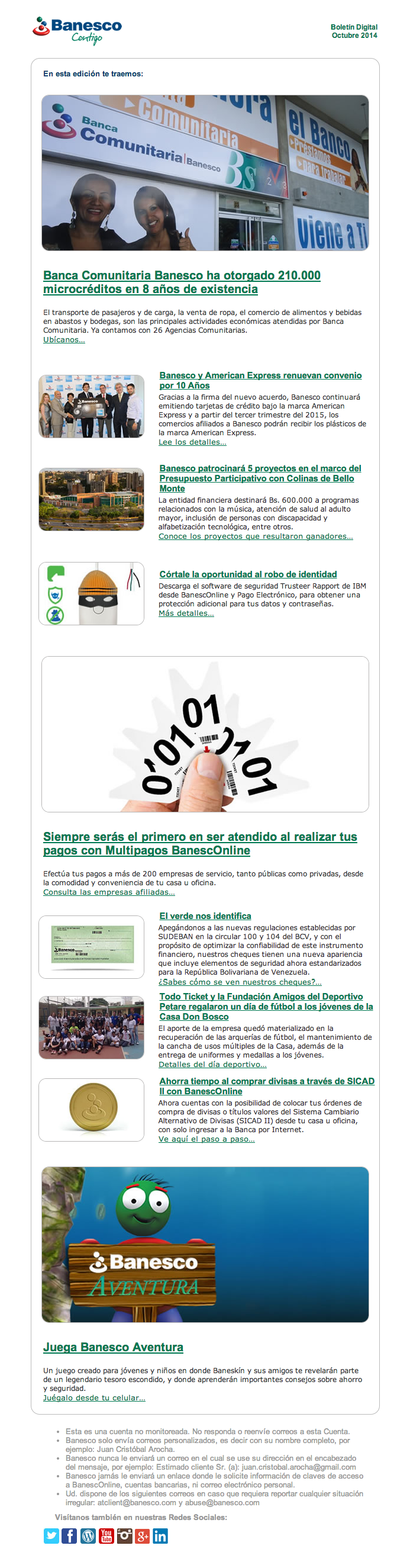 El Boletín Digital de octubre 2014 contiene la siguiente información: Banca comunitaria Banesco ha otorgado 210,000 microcréditos en 8 años de existencias, Banesco y American Express renuevan convenio por 10 años, TodoTicket y la Fundación Amigos del Deportivo Petare regalaron un día de futbol a los jóvenes de la casa Don Bosco, Ahorra tiempo al comprara divisas a través de SICAD II con BanescOnline.