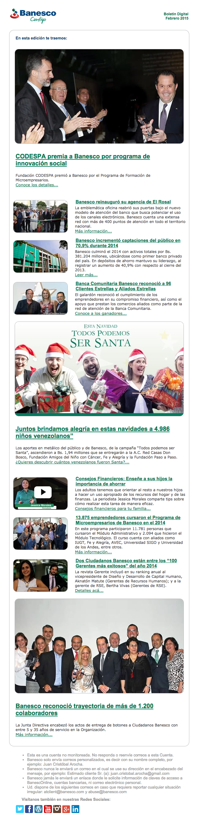 El Boletín Digital de febrero 2015 contiene la siguiente información: CODESPA premia a Banesco por programa de innovación social, Banesco incrementó captaciones del público 70,9% durante el 2014, Juntos brindamos alegría en estas navidades a 4,986 niños venezolanos, 13,875 emprendedores cursaron el Programa de Microempresarios en Banesco en 2014, Dos Ciudadanos Banesco están entre los "100 Gerentes más exitosos" del año 2014, Banesco reconoció trayectoria de más de 1,200 colaboradores.
