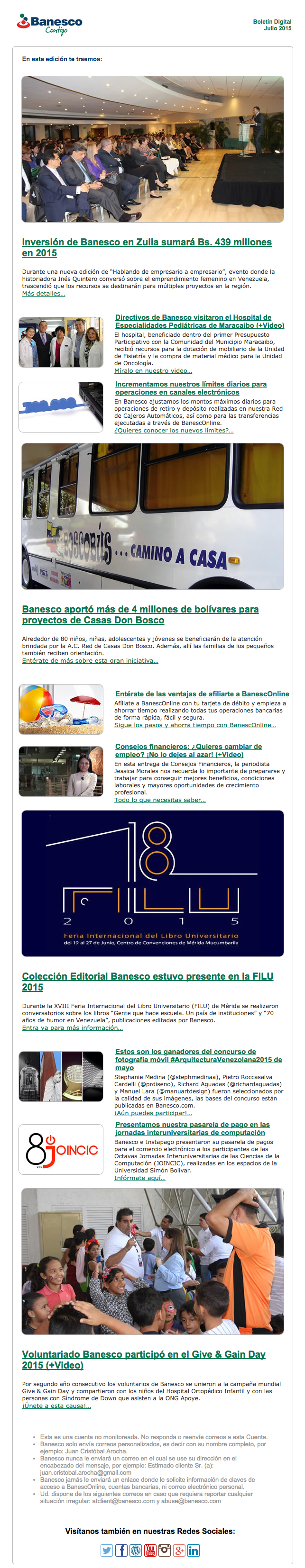 El Boletín Digital de julio 2015 contiene la siguiente información: Inversión de Banesco en Zulia sumará Bs. 439 millones en 2015, Incrementamos nuestros límites diarios para operaciones en canales electrónicos, Banesco aportó más de 4 millones de bolívares para proyectos de Casas Don Bosco, Colección Editorial Banesco estuvo presente en la FILU 2015, Presentamos nuestra pasarela de pago en las jornadas interuniversitarias de computación, Voluntariado Banesco participó en el Give & Gain Day 2015.