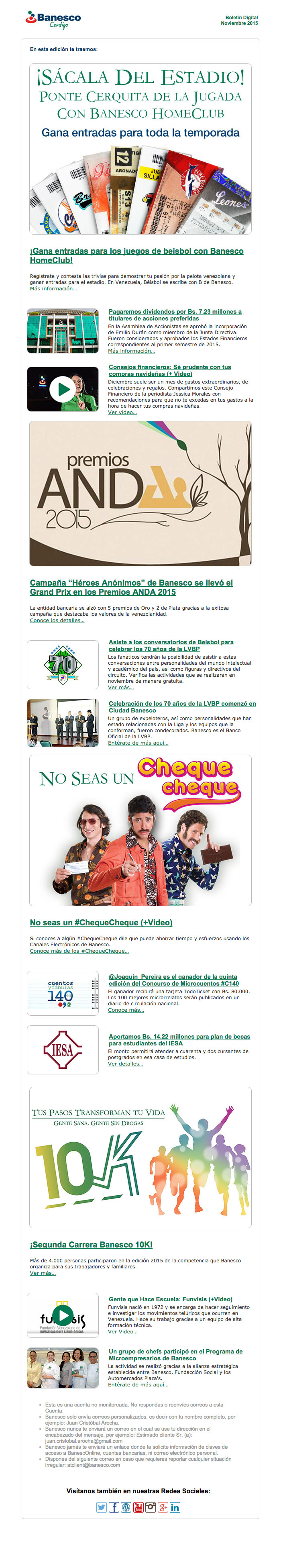 El Boletín Digital de noviembre 2015 contiene la siguiente información: Pagaremos dividendos por Bs. 7,23 millones a titulares de acciones preferidas, Campaña "Héroes Anónimos" de Banesco se llevó el Grand Prix en los Premios ANDA 2015, Segunda carrera Banesco 10K, Un grupo de Chefs participó en el Programa de Microempresarios de Banesco.