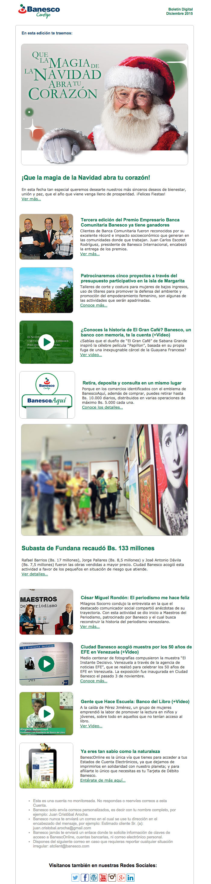 El Boletín Digital de diciembre 2015 contiene la siguiente información: Subasta de Fundana recaudó Bs. 133 millones, Ciudad Banesco acogió muestra por los 50 años de EFE en Venezuela, Patrocinaremos cinco proyectos a través del presupuesto participativo en la isla de Margarita.