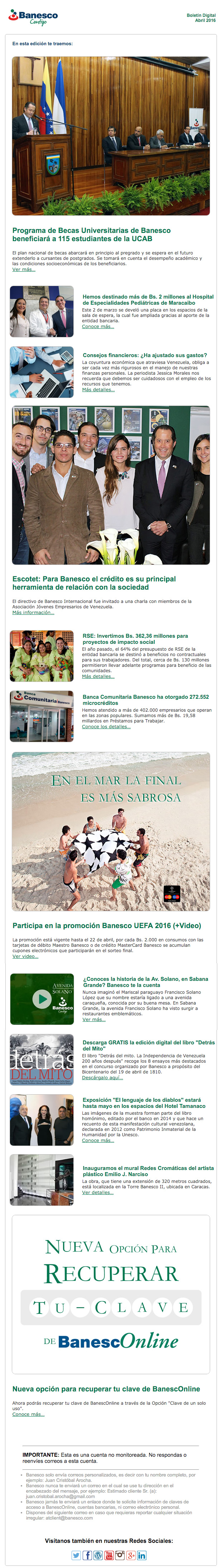 El Boletín Digital de abril 2016 contiene la siguiente información: Programa de Becas de Banesco beneficiará 115 estudiantes de la UCAB, Hemos destinado más de Bs. 2 millones al Hospital de Especialidades Pediátricas de Maracaibo, RSE: Invertimos Bs. 362,36 millones para proyectos de impacto social, Banca Comunitaria Banesco ha otorgado 272,552 microcréditos, Inauguramos el mural redes cromáticas del artista plástico Emilio J. Narciso.