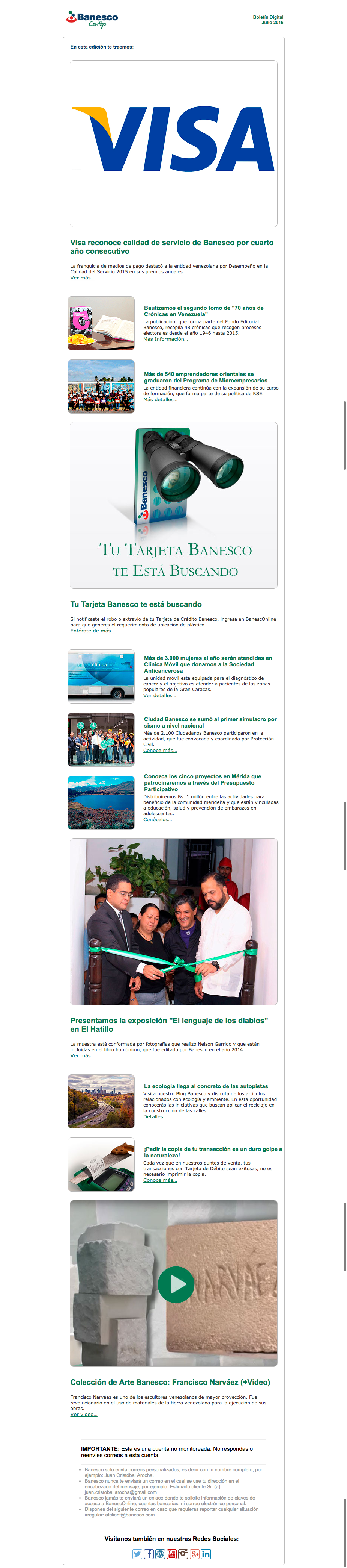 El Boletín Digital de julio 2016 contiene la siguiente información: Visa reconoce calidad de servicio de Banesco por cuarto año consecutivo, Más de 540 emprendedores orientales se graduaron del Programa de Microempresarios, Más de 3,000 mujeres al año serán atendidas en clínica móvil que donamos a la Sociedad Anticancerosa.