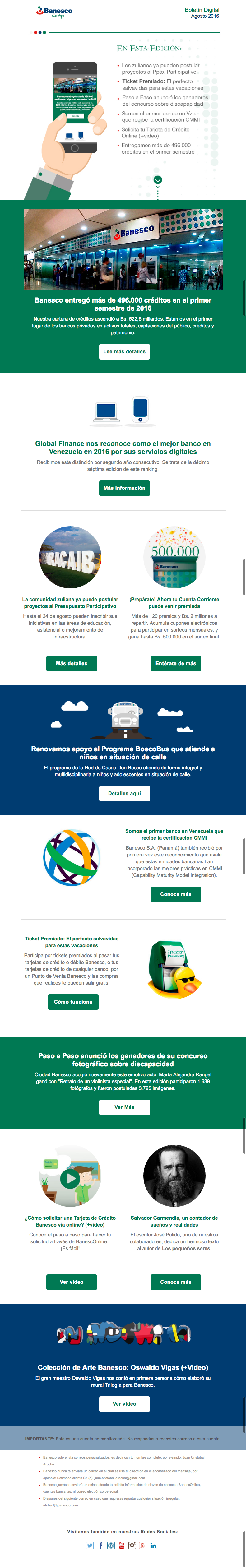 El Boletín Digital de agosto 2016 contiene la siguiente información: Banesco entregó más de 496,000 créditos en el primer semestre de 2016, Global Finance nos reconoce como el mejor banco en Venezuela en 2016 por sus servicios digitales, Somos el primer banco en Venezuela que recibe la certificación CMMI, la comunidad Zuliana ya puede postular proyectos al Presupuesto Participativo.