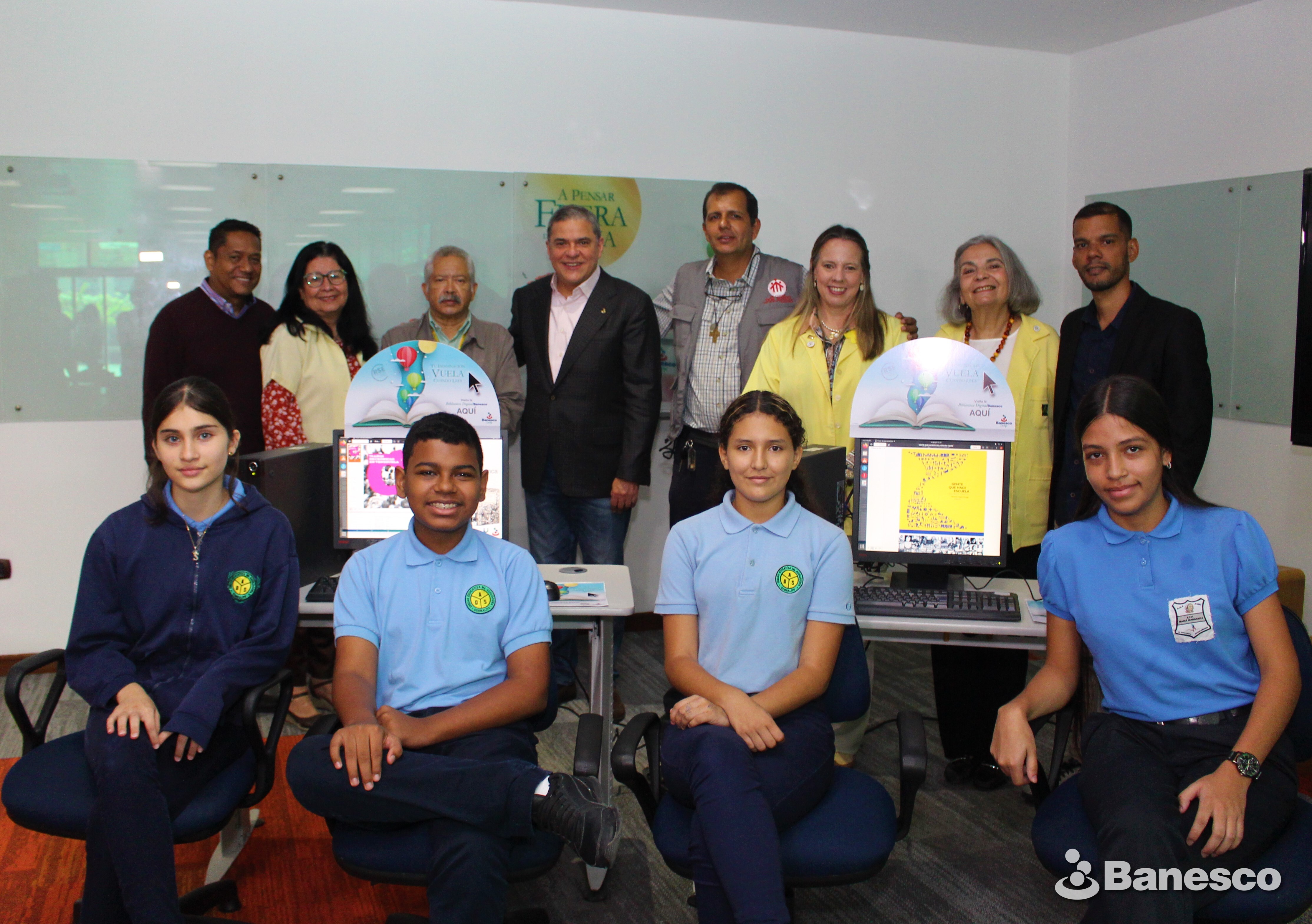 Marco Ortega, presidente de Banesco Banco Universal, junto a las Damas Salesianas y algunos alumnos y representantes de la Red de Casas Don Bosco, sonrientes, en la terraza del piso 4 de Ciudad Banesco, luego de haber firmado el documento que formaliza la entrega de computadoras