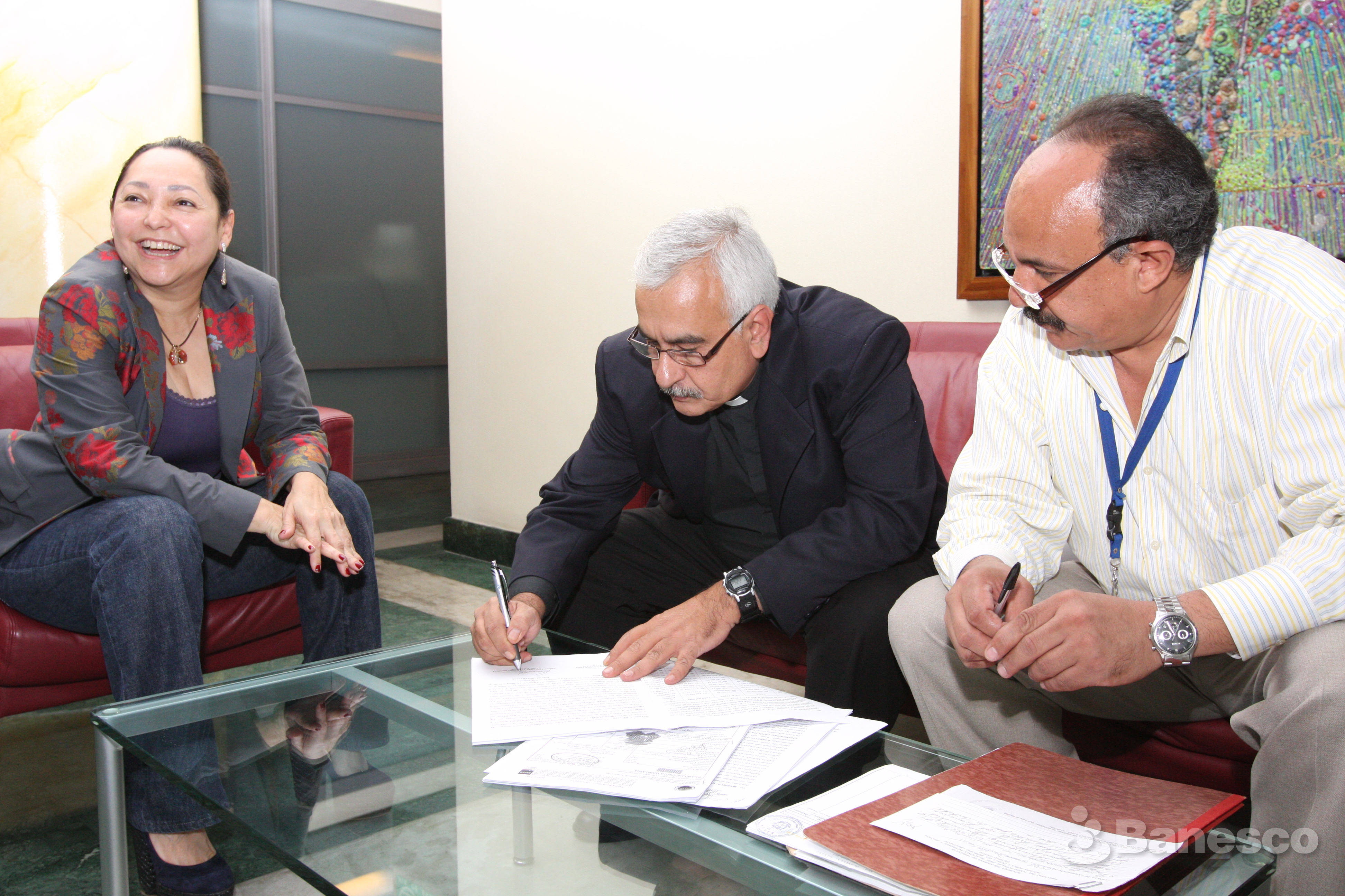 Mariela Colmenares Vp. de Comunicaciones y RSE de Banesco junto a José Virtuoso, s.j., Rector de la UCAB en presencia de notario público firman el convenio para costear la expansión y desarrollo del Centro Cultural Padre Guillermo Plaza s.j de la Universidad Católica Andrés Bello.