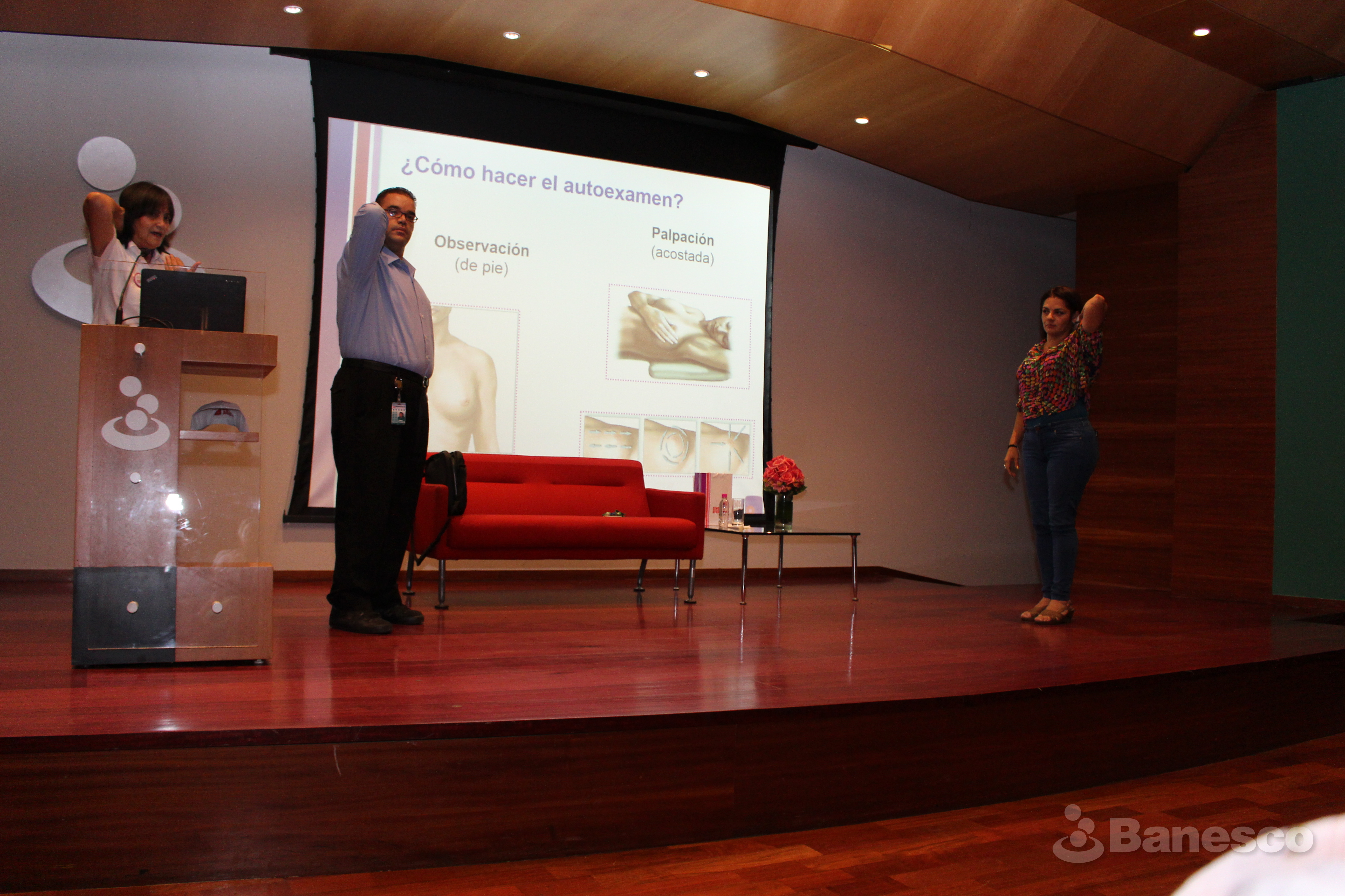 Durante la charla sobre la prevención del cáncer de seno, en el marco de las Jornadas de Octubre Rosa, se realizó en el escenario una explicación sobre ¿Cómo hacer el autoexamen?.