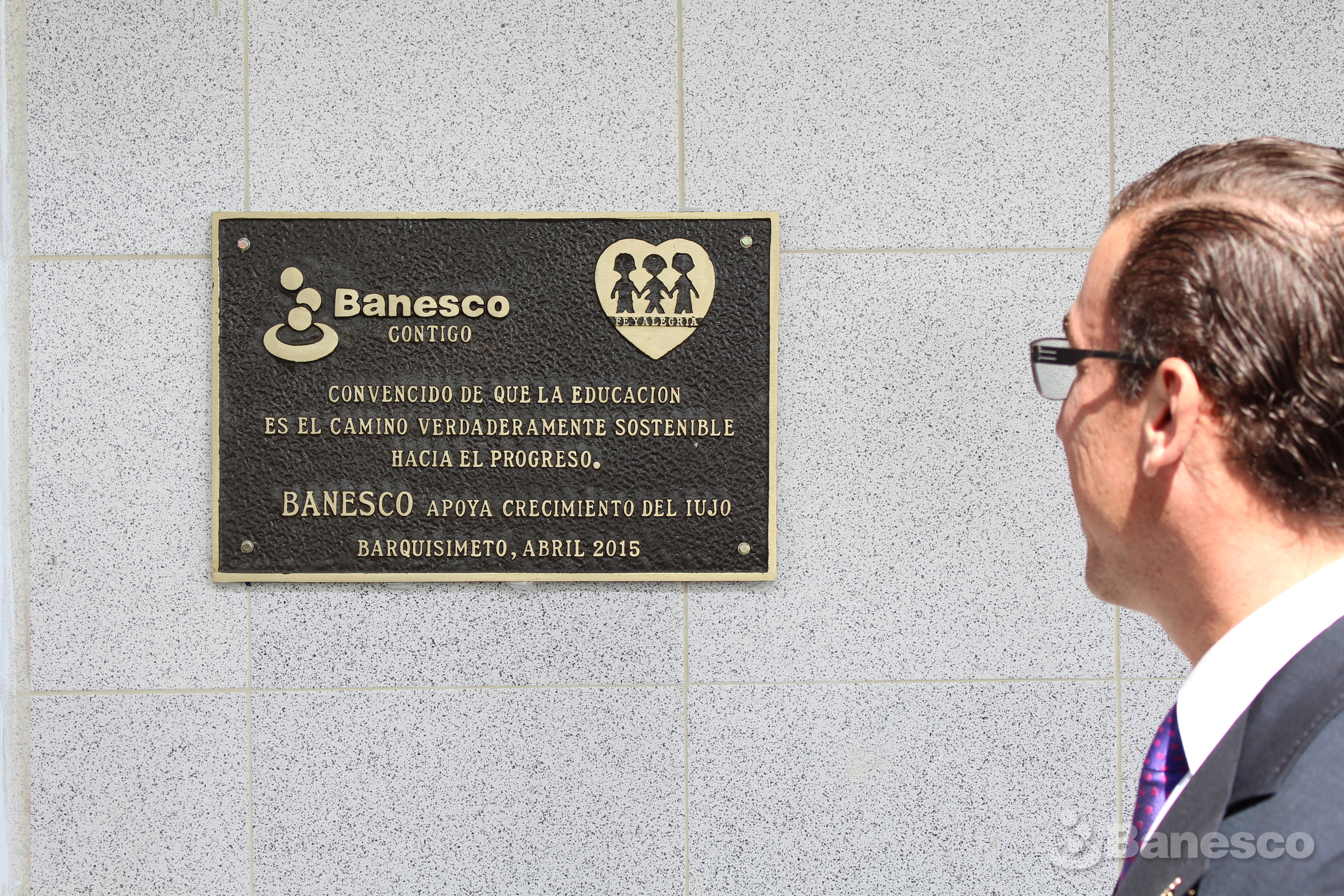 Presidente ejecutivo de Banesco, lee detenidamente la placa conmemorativa de agradecimiento a la institución financiera por el apoyo de la entidad el cual ha permitido el desarrollo de proyectos educativos en este núcleo larense, perteneciente a Fe y Alegría.