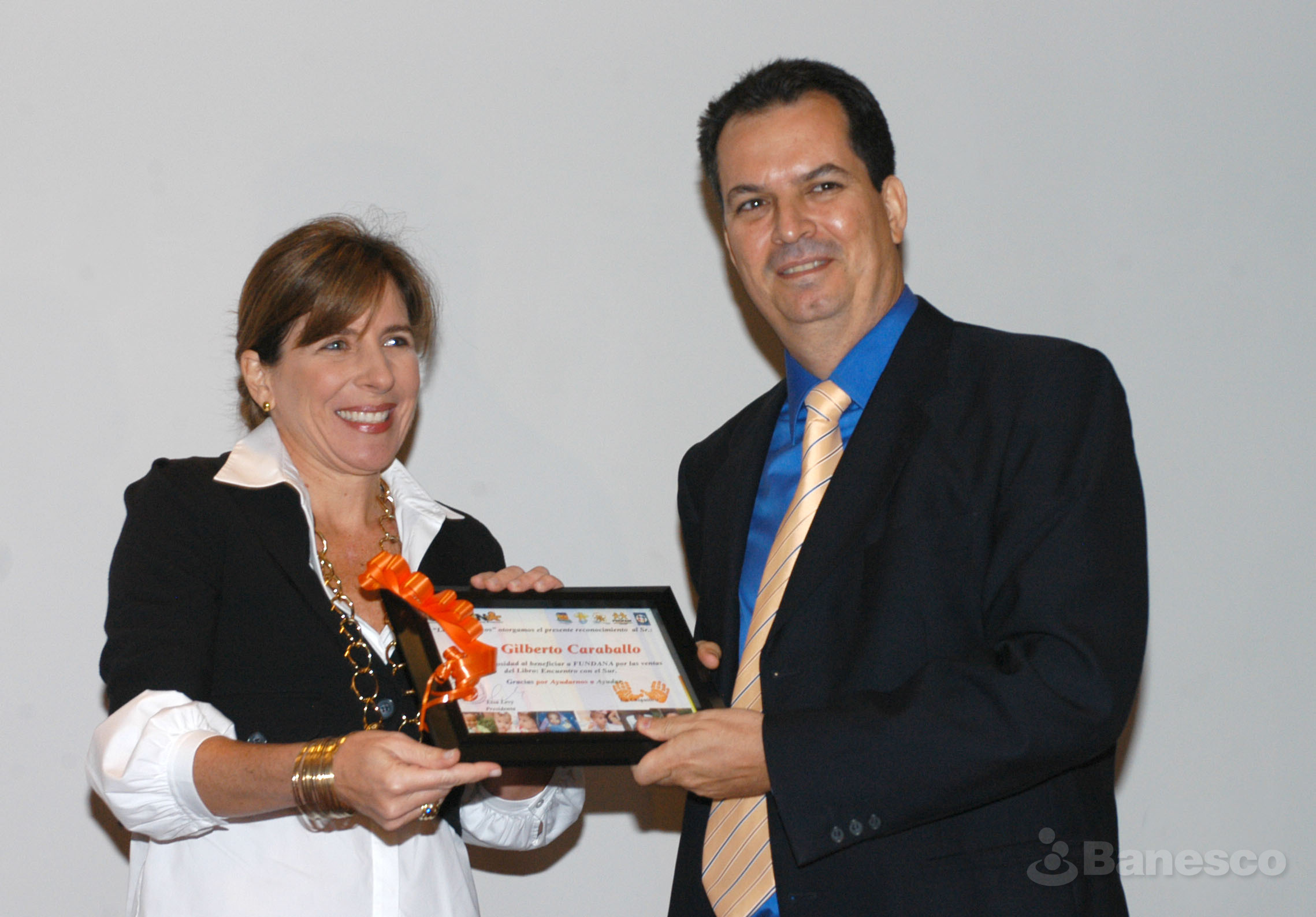 Entrega de reconocimiento para el autor Luis Gilberto Caraballo por beneficiar a la Fundación Amigos del Niño que Amerita Protección (Fundana) por las ventas del libro del poemario Encuentro con el sur.