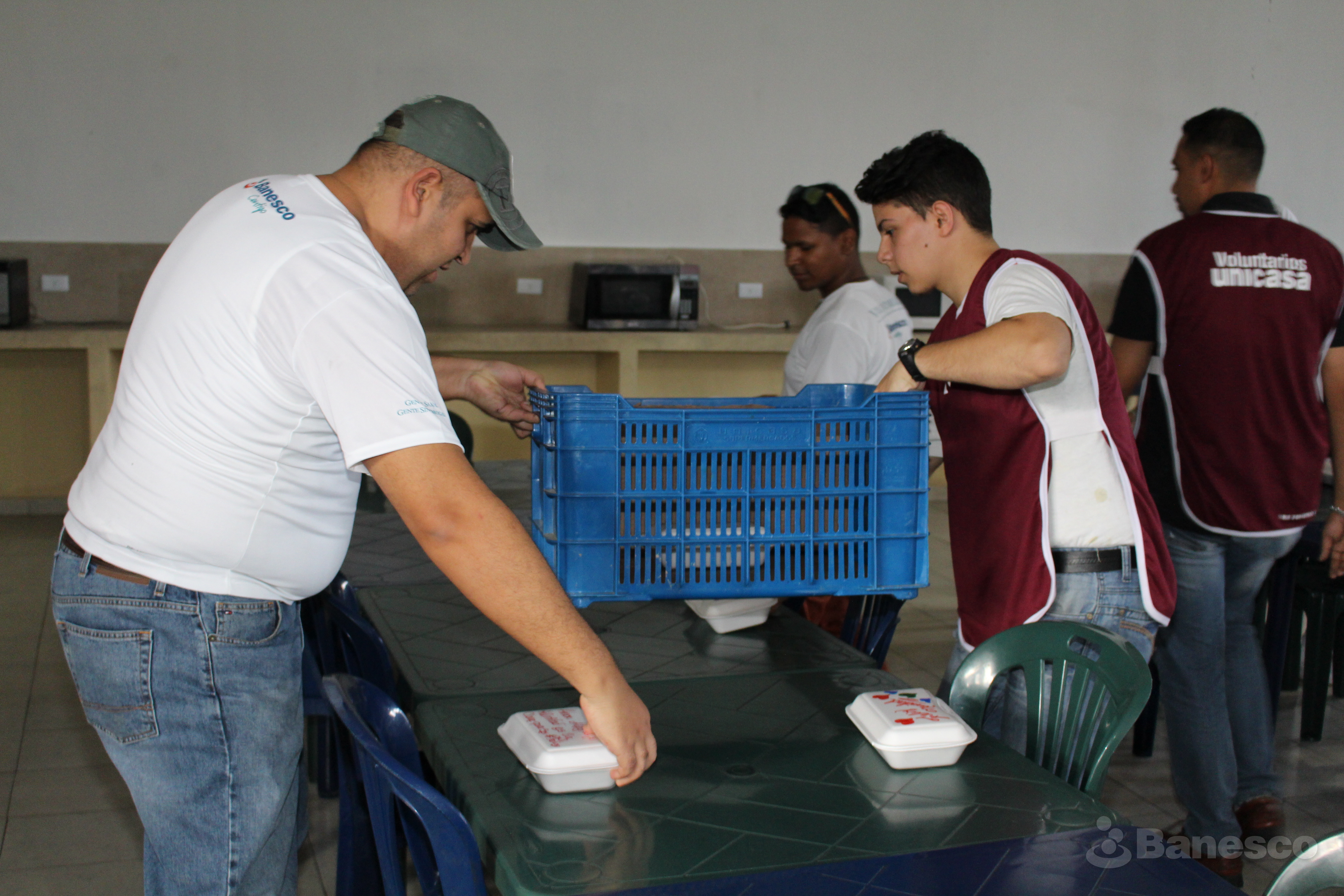Voluntarios de Banesco y Unicasa organizan los platos de comida en las instalaciones de Asociación Civil Hogar Bambi