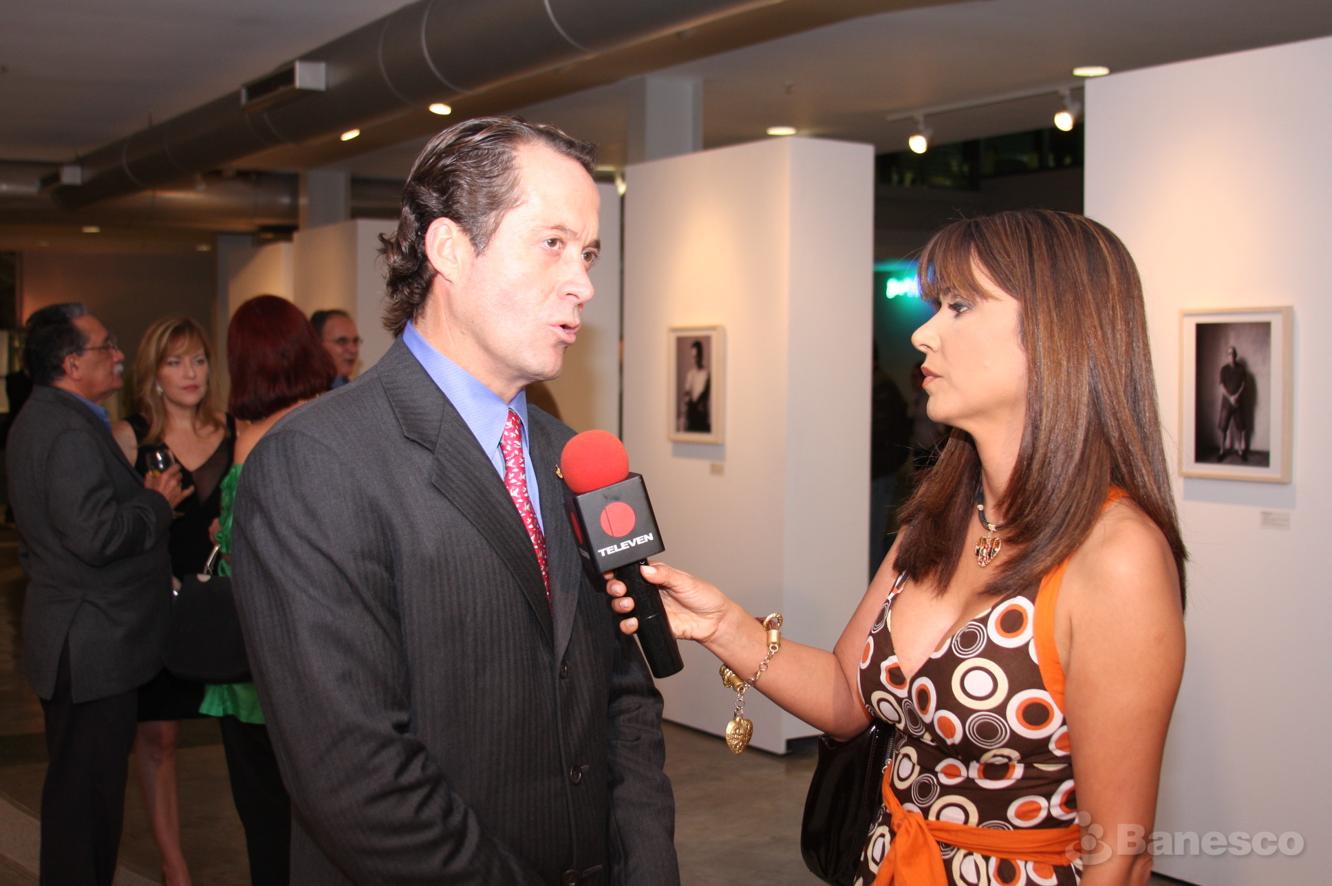 La presentadora y locutora Claudia Hernández de la cadena televisiva Televen, entrevista al presidente ejecutivo de Banesco Juan Carlos Escotet, durante la presentación del libro "Periodistas" del reconocido fotógrafo Vasco Szinetar.
